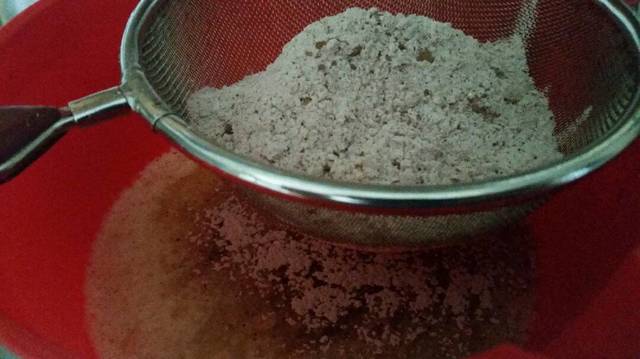 Bước 2: Rây bột mì, bột cacao, bột nở vào âu hỗn hợp.